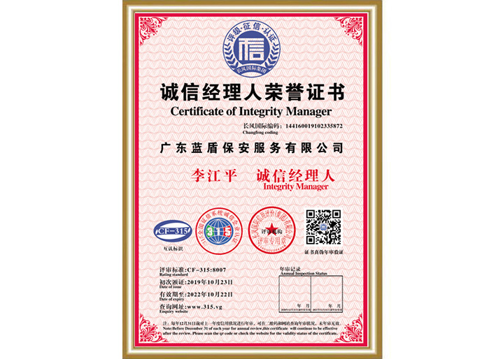 誠信經(jīng)理人榮譽(yù)證書